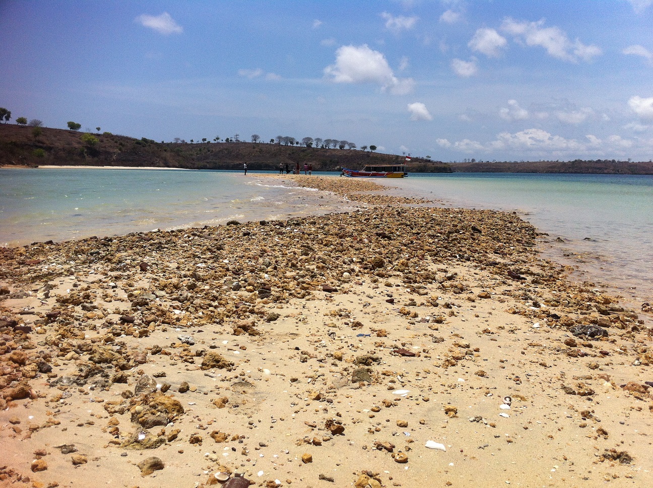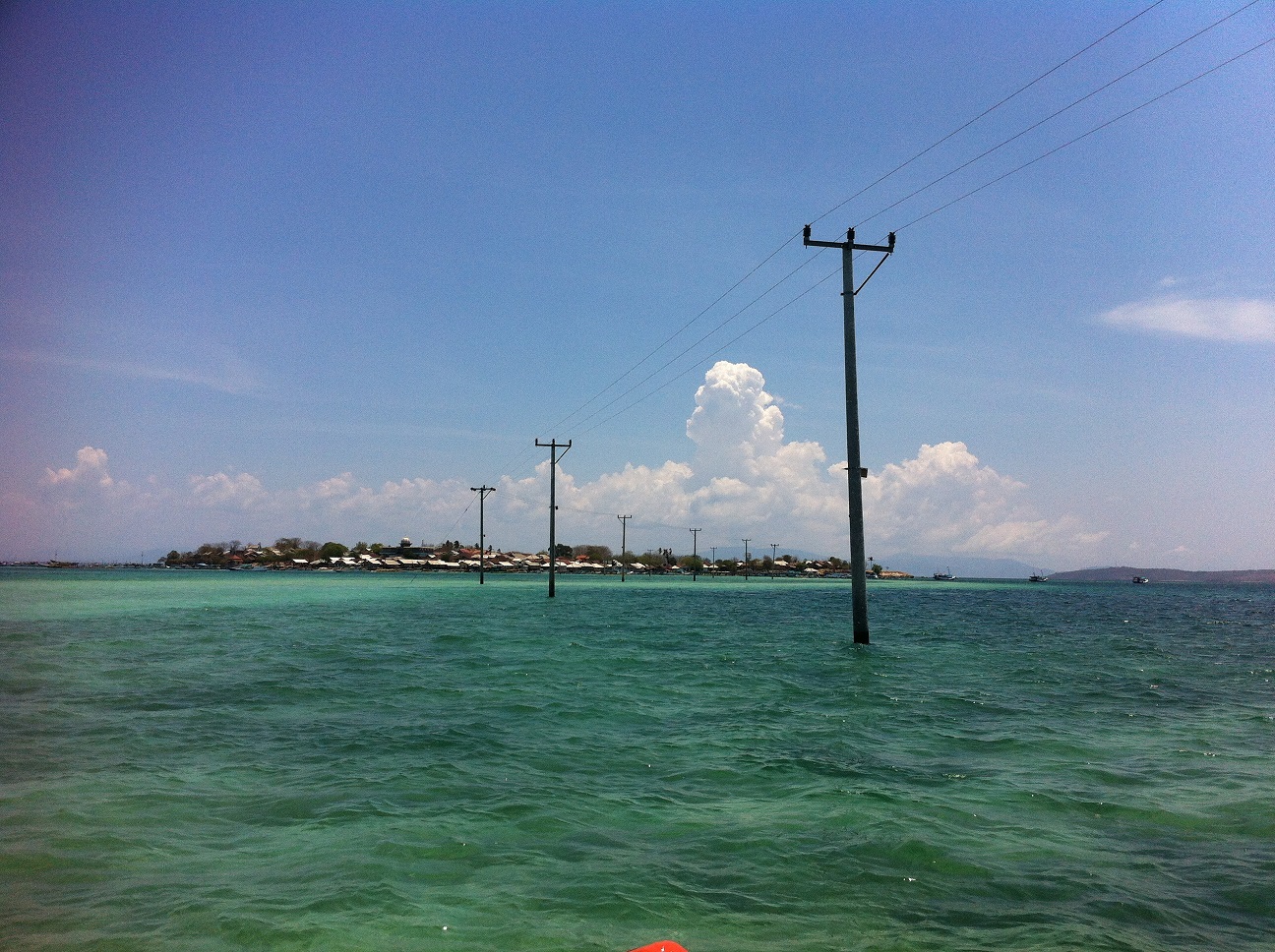 Jalan menuju Gili Maringkik sejatinya bisa kami tempuh dengan berjalan kaki. Jika air sedang surut, timbunan pasir bisa dijadikan pijakan untuk melangkah. Namun saat kami ke sana, air sedang pasang sehingga timbunan pasir tertutup air laut. Hanya deretan tiang listrik saja yang terlihat, yang menandakan bahwa benar ada jejak jalan yang tersembunyi di bawahnya. Inilah kali pertama saya melihat tiang listrik di tengah laut.